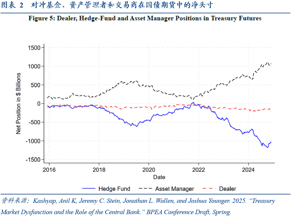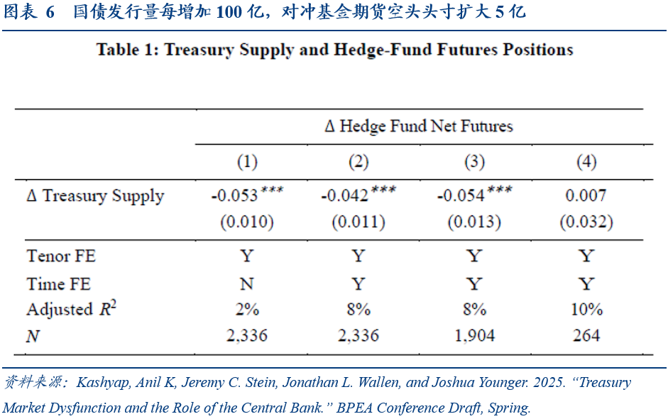 国债供应的持续增加将促使对冲基金在国债-期货基差交易中持有更大的杠杆头寸。资产管理者(Asset Manager)需通过期货延长久期,推高对冲基金(Hedge Fund)以及经纪交易商(Dealer)的套利需求。根据Kashyap et al.(2025)的实证结果,国债发行量每增加100亿,对冲基金期货空头头寸扩大5亿。