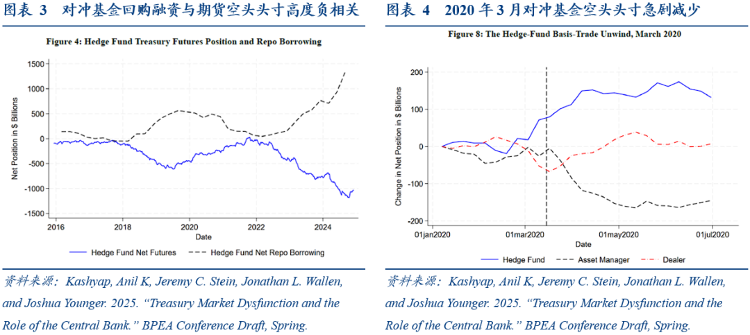 根据Kashyap et al.(2025),美债基差交易中有三大参与者,即资产管理者(Asset Manager)、对冲基金(Hedge Fund)以及经纪交易商(Dealer)。资产管理者的衍生品需求推高基差,吸引高杠杆对冲基金套利,而交易商受限于资本约束,在压力时期无法充分吸收平仓冲击,导致市场功能恶化。