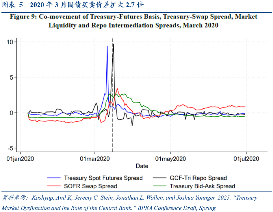 经纪交易商通过做市(提供流动性)和套利(吸收基差)实现维持市场的功能,但受到监管约束(补充杠杆比率)的限制。由于经纪交易商需在做市、基差套利、回购中介间分配有限资本,压力时期被迫收缩业务。例如,2020年3月,经纪交易商吸收对冲基金抛售的570亿美元现券,但导致做市能力下降,国债买卖价差扩大了2.7倍。